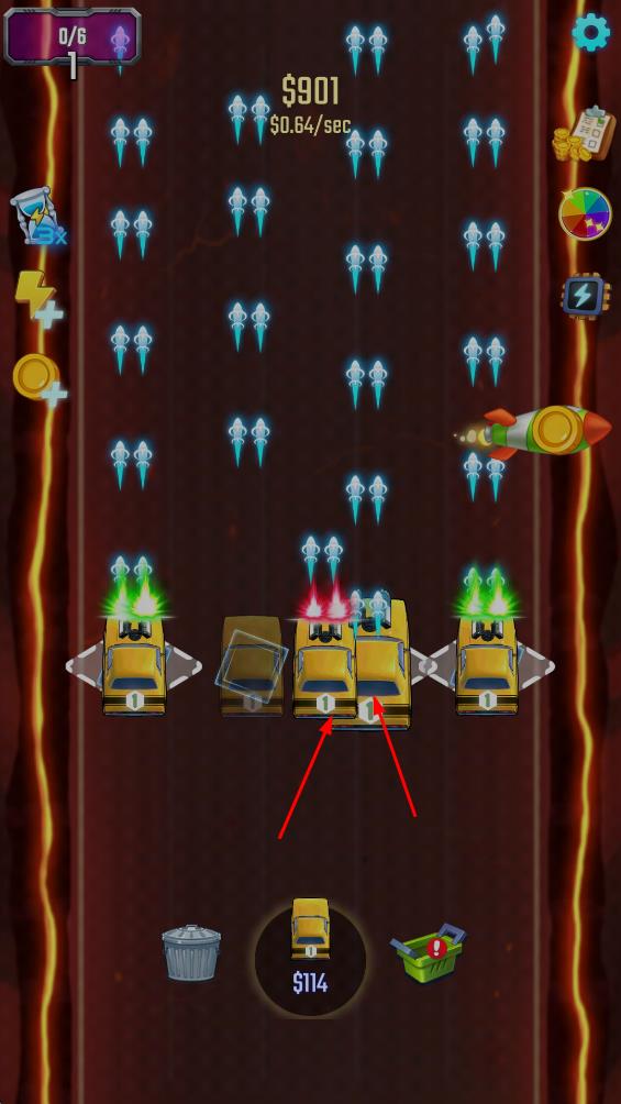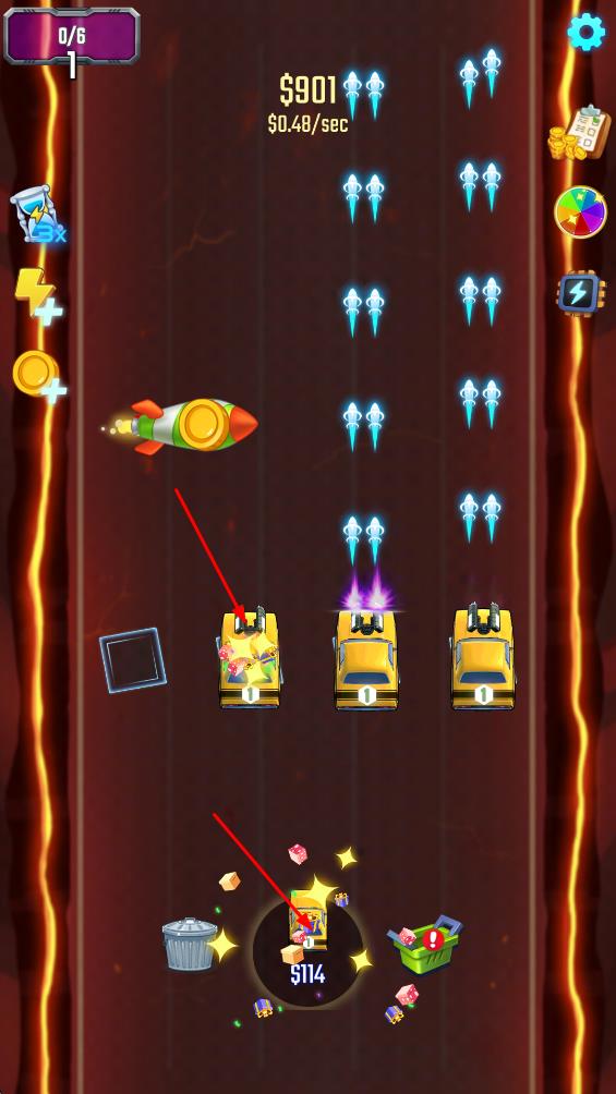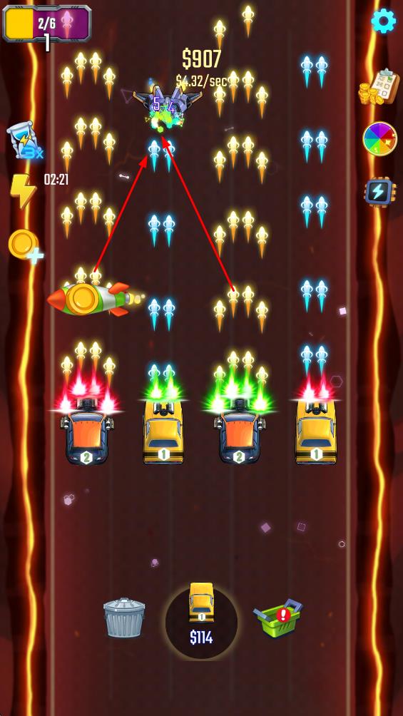1、合并升级汽车体系:采用经典空闲游戏的合并机制,同级别的汽车可通过合并升级,不仅解锁不同种类与外观的车辆,还能提升基础属性,为后续射击与抵抗敌人提供更强基础。