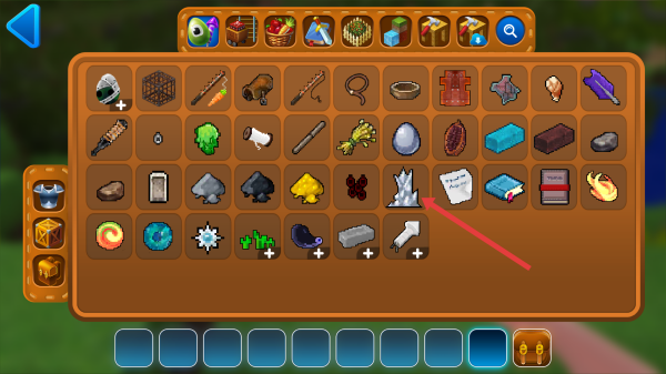 2、打开背包棕色包,整理工具、资源,长按物品拖到快捷栏,方便使用如镐子挖矿、斧子砍树。