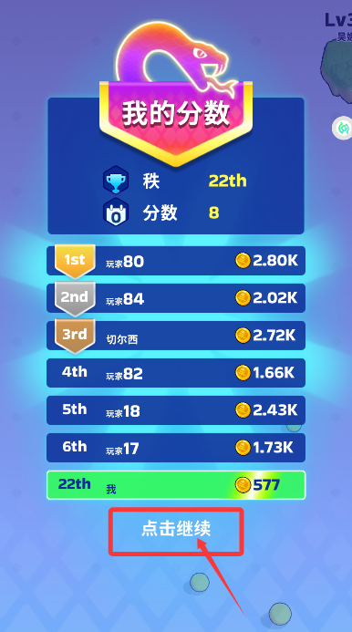 3、对战结束弹出成绩单,查看最终名次与得分后可点击继续挑战。