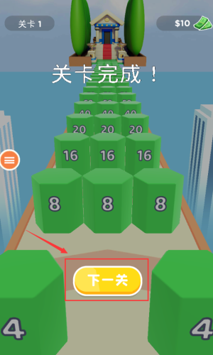 4、点击红框下一关按钮,完成关卡继续挑战。