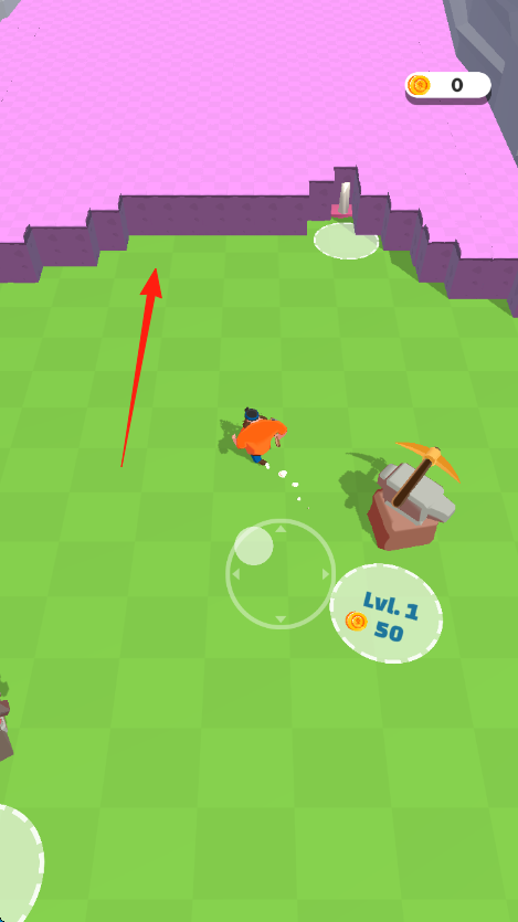 1、操控橙色角色,沿箭头挖紫色墙,用工具采矿,收集蓝色方块,积累资源,推进关卡,升级解锁新工具。