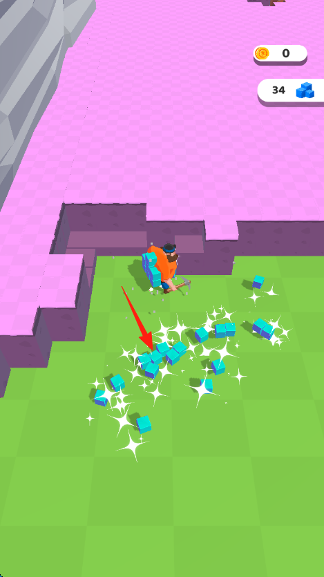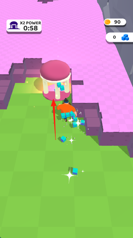 3、带着方块找粉色建筑,交付资源,触发升级如x2POWER,增强能力,挖更多资源,通关晋级,解锁新区域。