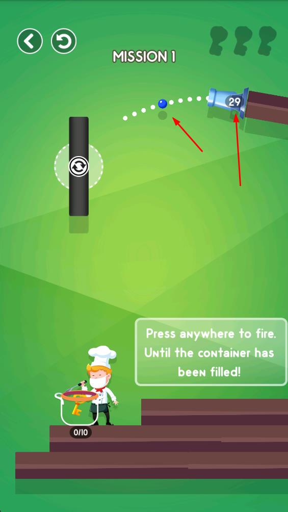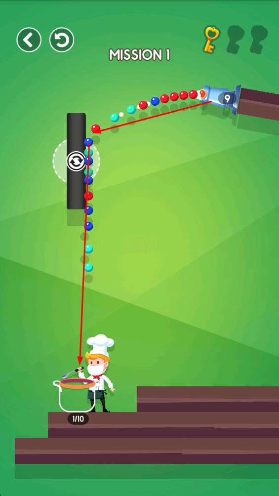 3、使彩球经黑色物件阻挡后,落入厨师前方容器,达成收集数量目标。