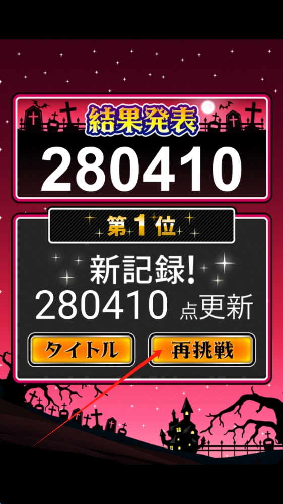3、结算后,若想刷新记录,点击再挑戦,重新开始游戏,冲击更高分,点击按钮再进行挑战。