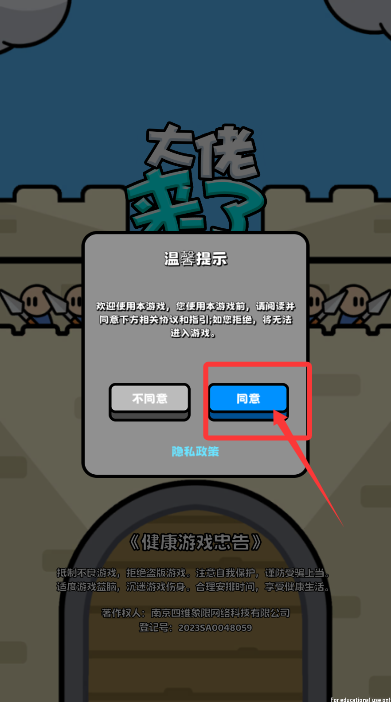 1、首次进入游戏需确认温馨提示,点击同意按钮开启雪地冒险。