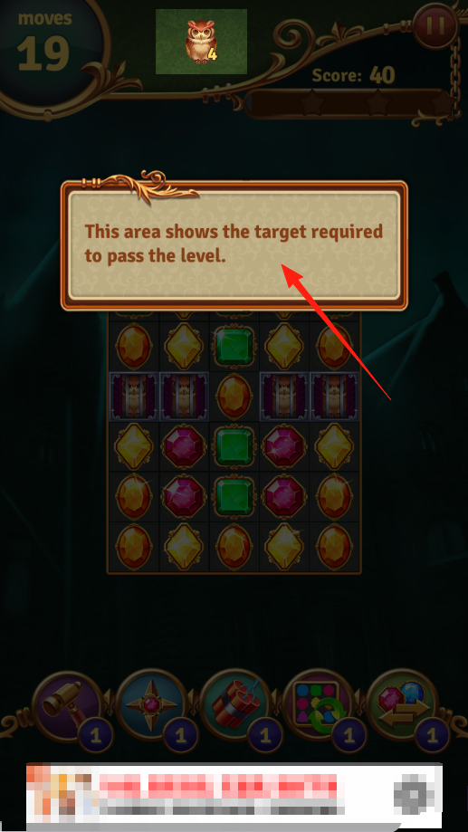 3、现在界面提示这区域显示通关需要的目标,先看清楚要消除哪些宝石,凑啥图案,然后在棋盘里找对应宝石,交换位置消除,靠消除进度推进,完成关卡要求。
