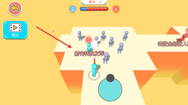 3、战斗阶段,操控角色射击灰色小人,触发“射击转换友军”机制,将其变为己方成员,逐步击败敌人,推进关卡1的进程,完成挑战。