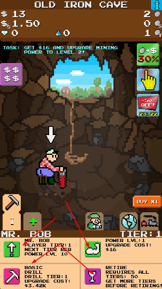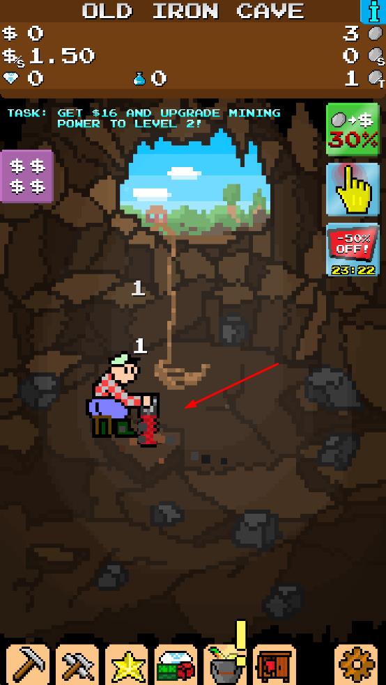 1、进入OLDIRONCAVE,操控角色用钻机挖矿,积累金币。