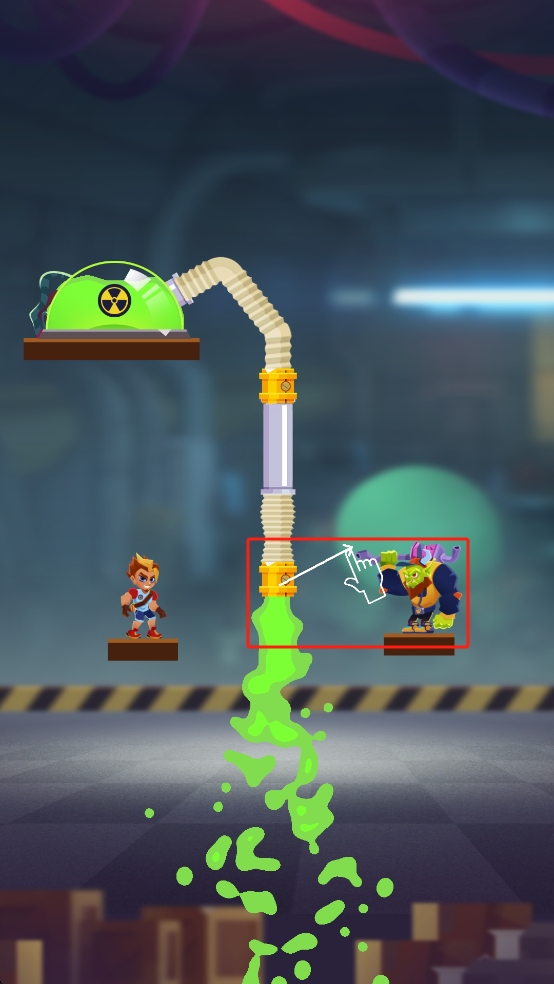 2、完成第一步对接后,再次拖动管道相关部件,调整连接路径,让绿色毒液顺着新管道走向,精准导流到右侧怪物所在位置。