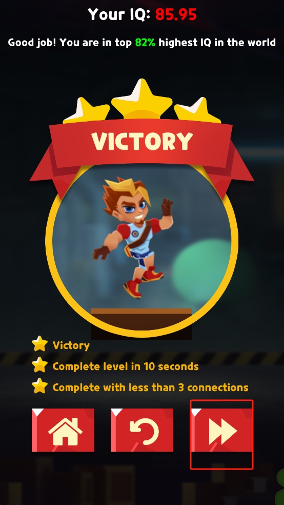 3、成功用毒液击败怪物后,界面显示胜利信息,呈现IQ值、星级奖励,点击右下角红色箭头按钮,即可进入下一关。