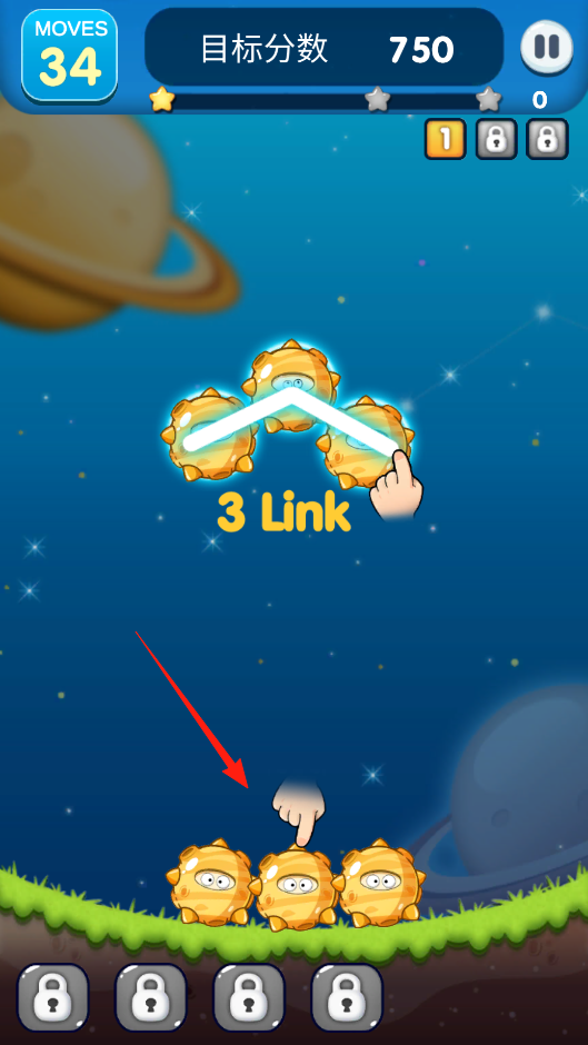 1、进入游戏,看到三个小怪物排成行,按提示用手指把它们连起来,像上面示范的3Link那样,连好就能消除得分,朝着750分目标推进,每一步都算在34步里。