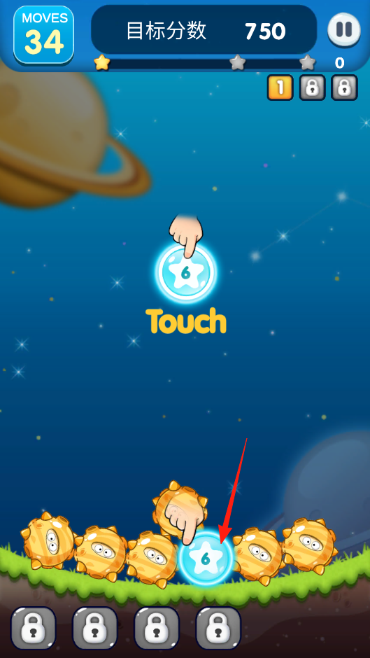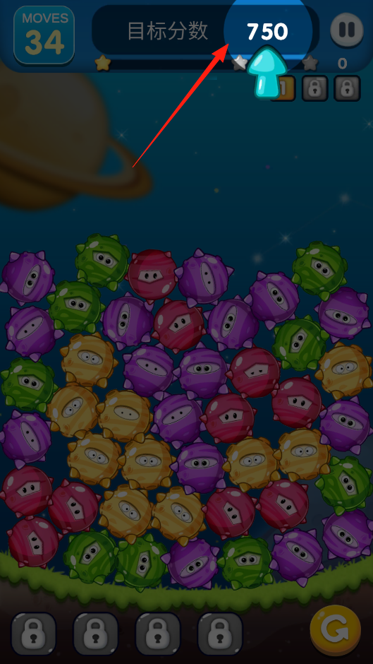3、现在要凑够750分,屏幕一堆彩色怪物,找同色的连起来消除,每消除一组得分,注意步数限制34步,尽量多连消大组,靠消除得分,直到达到目标分数,通关成功。