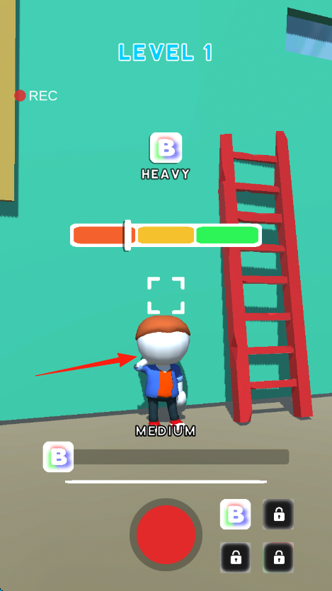 2、移动角色到梯子旁,按红按钮,调整力度SOFT,拍照角色,使其触碰绿色瞄准框,完成阶段任务,推进关卡。