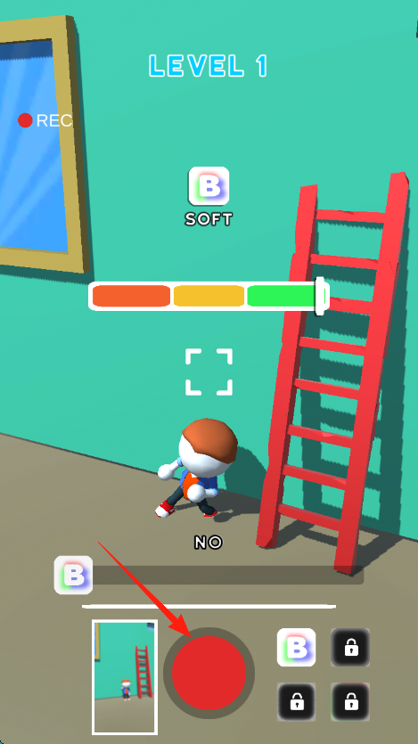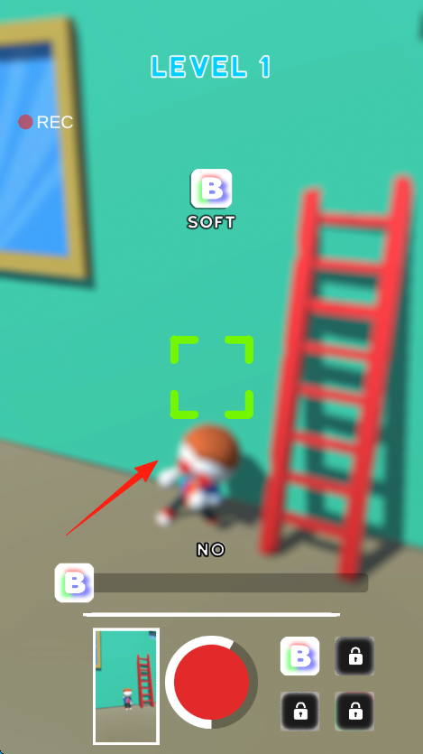 3、针对SOFT力度,瞄准梯子旁区域,点红按钮拍照角色,让其进入绿色框,达成条件,通过LEVEL1,解锁新关卡。