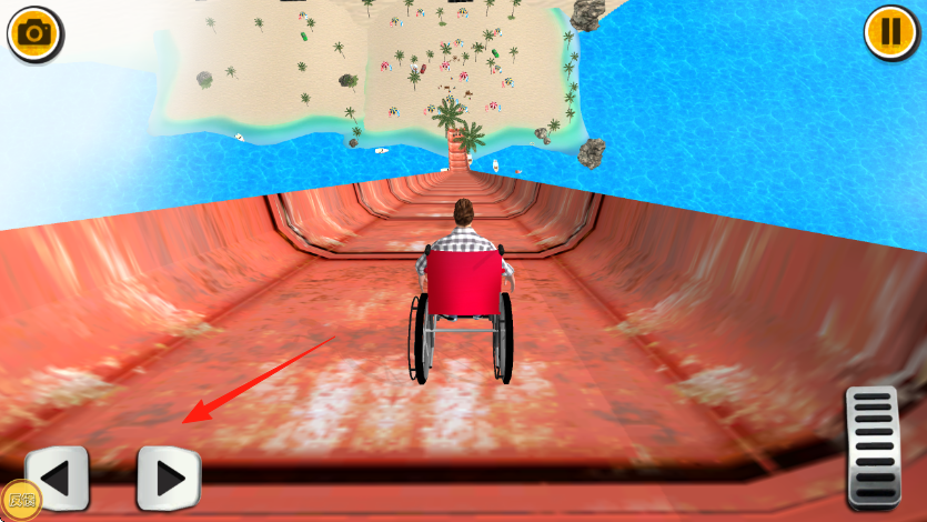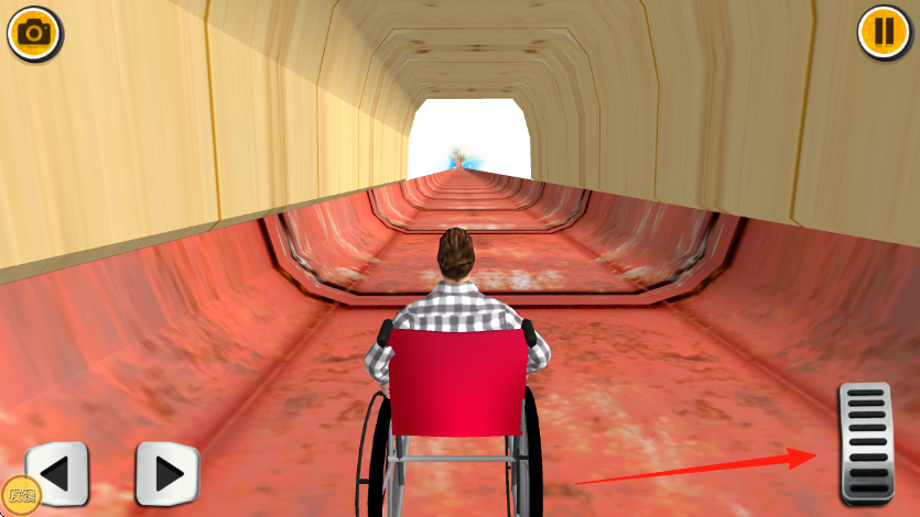 2、在管道内,用右侧踏板控速度,左侧按键调方向,避管道障碍,向出口冲,保持轮椅稳定,继续滑行。