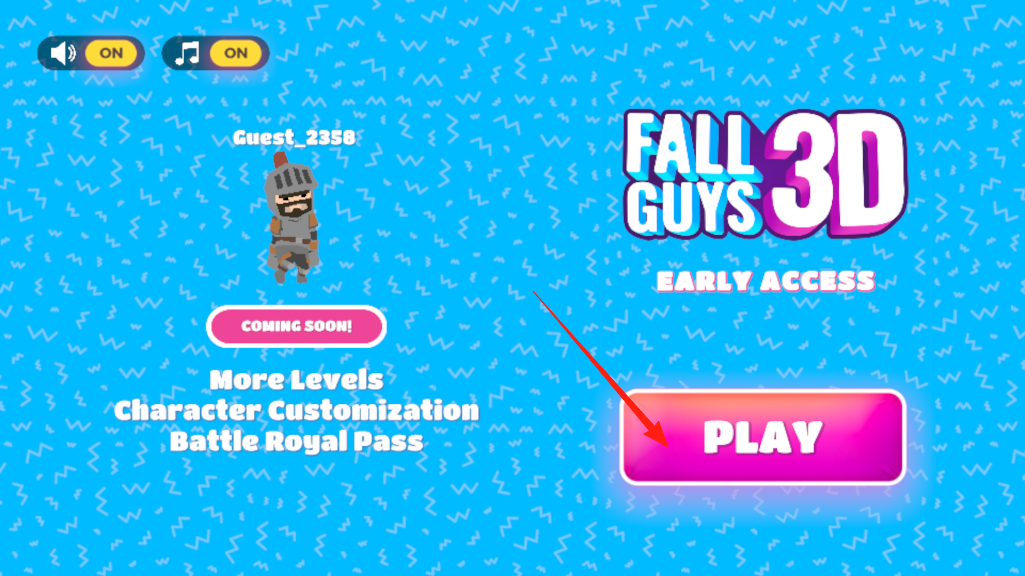 1、打开游戏主界面,看到FALL GUYS3D,点PLAY按钮就能进入游戏,进去前能看到即将更新的内容,像更多关卡角色自定义这些,先点play开始玩。