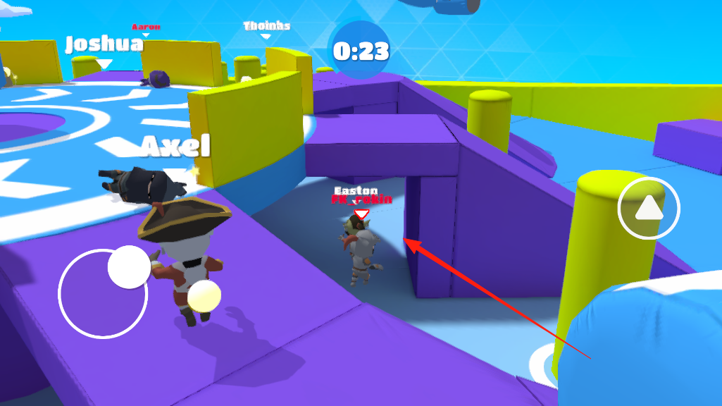 3、在限时模式里,屏幕显示剩余23秒,操控角色在场地穿梭,追着带尾巴的敌人跑,避开其他玩家,找机会接近目标,抓住他们的尾巴完成任务,争取在时间到前多抓几个,拿高分。