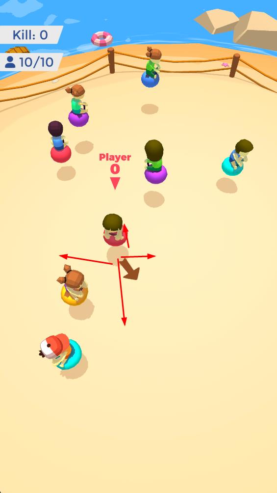 1、操控角色在沙滩移动,通过碰撞将其他玩家挤向边缘,开启淘汰竞赛。