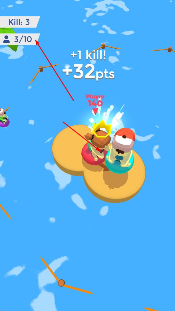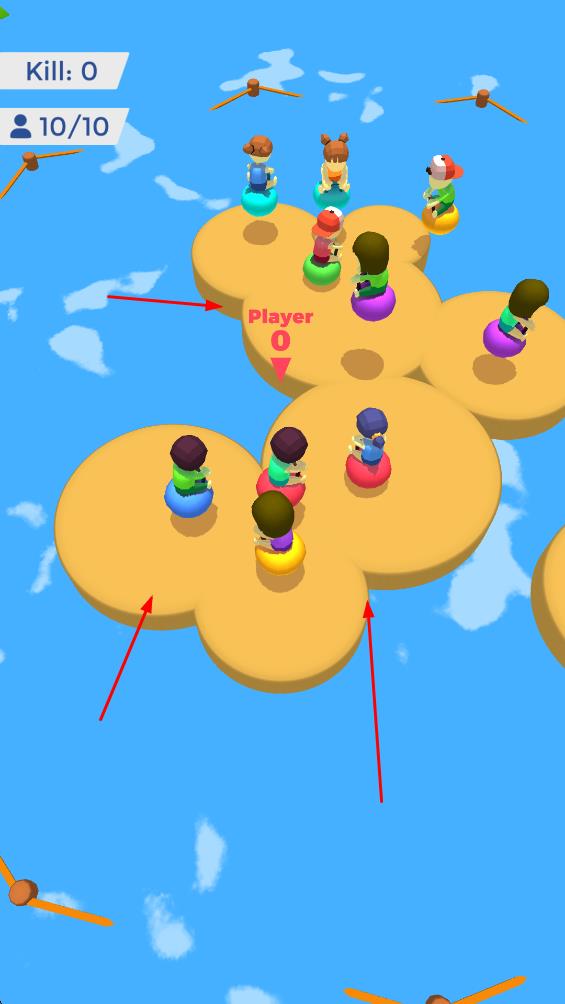 2、场景出现浮岛区域,借助地形边缘,将对手挤落浮岛,扩大生存空间。