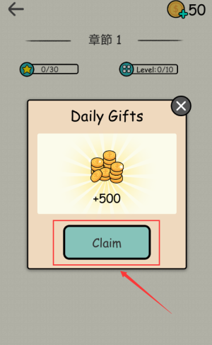 1、点击红框Claim按钮,领取每日500金币奖励。