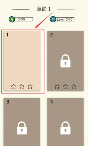 2、选择红框数字1关卡,开始第一章游戏挑战。