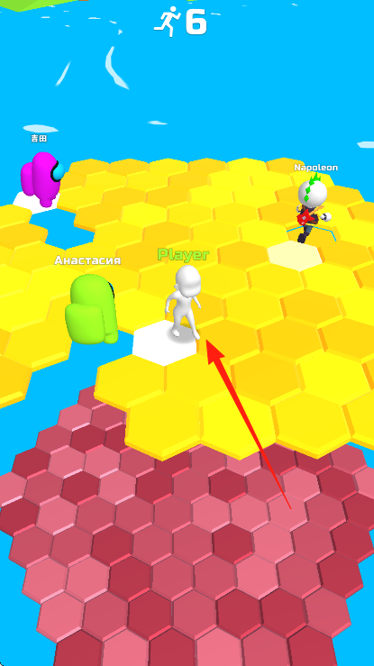 3、移动角色,占相邻六边形,围领地得分,避其他玩家碰撞,存活到最后,或占最多格子,赢比赛,解锁新皮肤、场景,继续六边形对战。