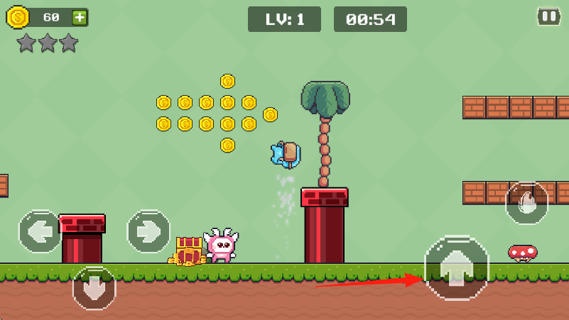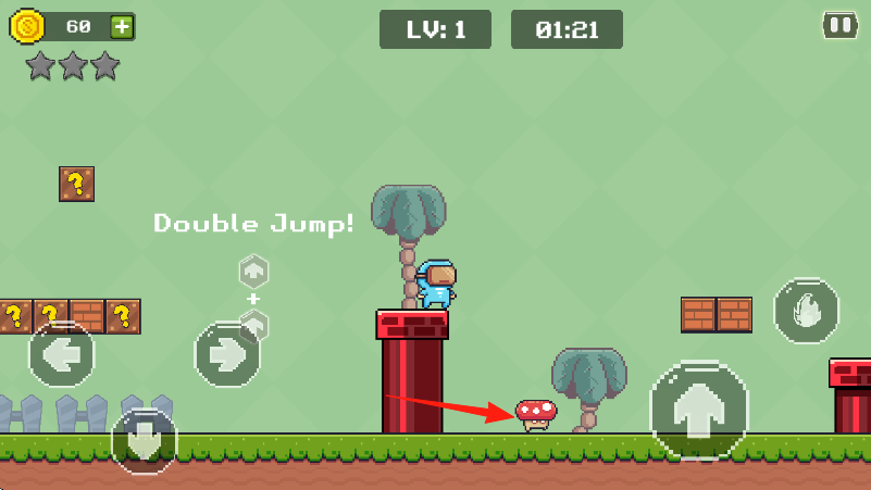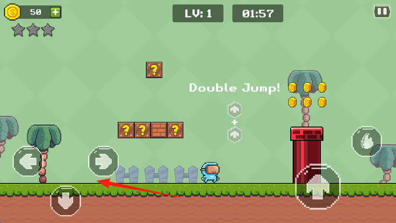 2、操控角色,沿箭头跑,跳红管道,避蘑菇怪,顶问号砖,触发DoubleJump二段跳,收集金币,积累分数,晋级。