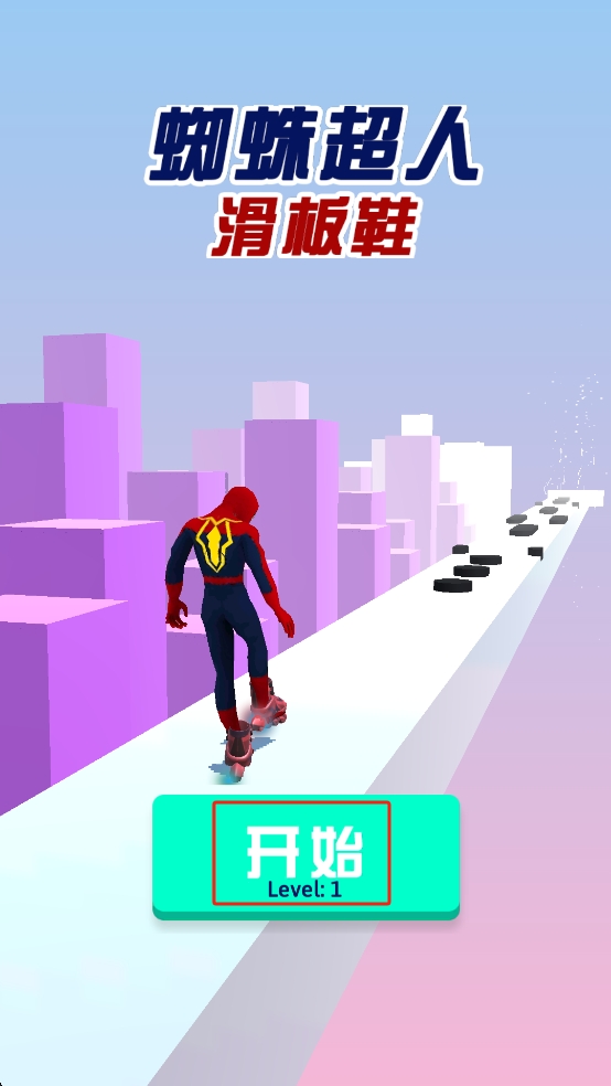 1、这里我们点击界面中间绿色的开始按钮,操控身着特殊战衣的蜘蛛超人,在城市背景的滑板赛道上开启滑行。