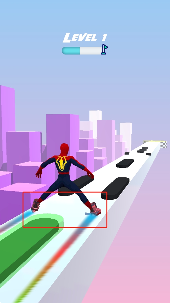 2、滑行过程中,遇到黑色障碍物时,灵活通过左右移动角色,或是适时张开双腿的方式跨越障碍,始终保持在赛道行进。