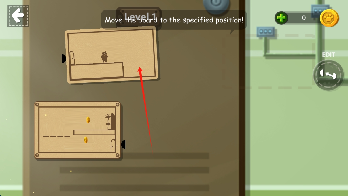 1、按提示移动上方木板到指定位置,搭建关卡初始通路,为猫咪行动创造基础环境。