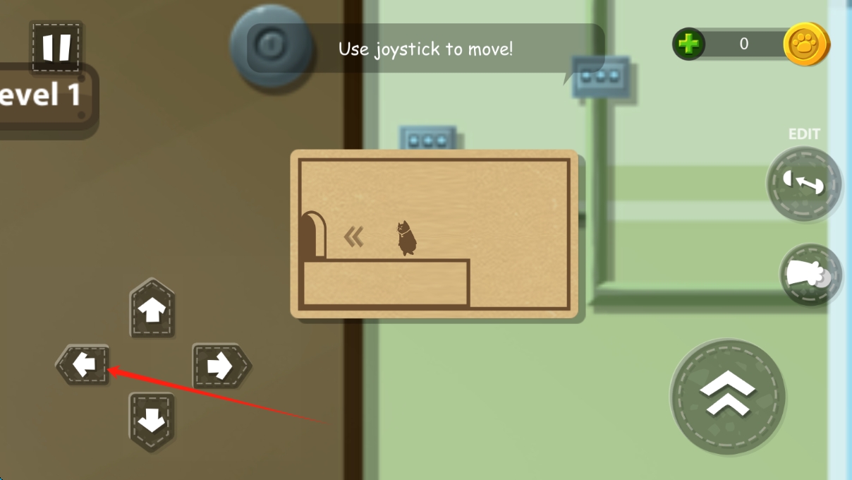 2、利用左下角摇杆控制猫咪移动,向左操作让猫咪在木板场景中探索,靠近关键区域。