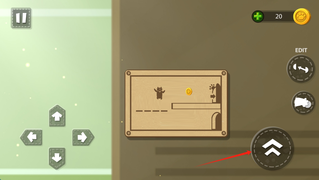 3、在下方木板场景,点击右侧箭头按钮,助力猫咪跨越障碍,收集金币并抵达目标位置。