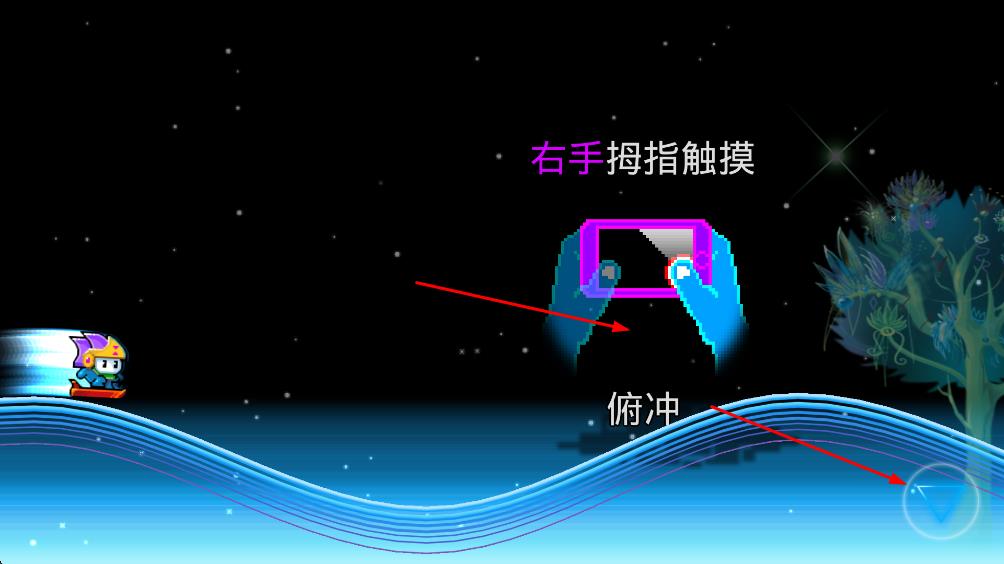 1、右手拇指触碰右下按钮,操控角色俯冲加速,沿蓝色地形滑行,开启冒险。
