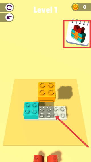 2、拖拽下方方块,对照右上角图案的颜色与位置,精准拼接组合,完成Level-1的积木造型搭建任务。