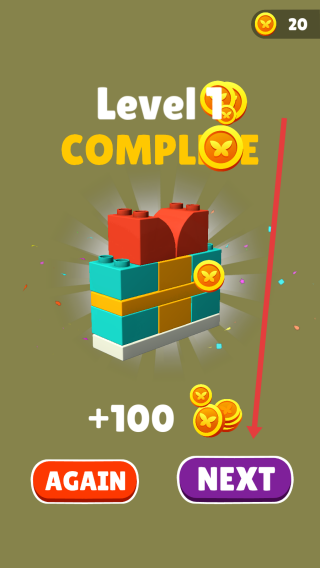 3、Level-1完成后,点击紫色NEXT按钮,领取20金币与100奖励,进入下一关延续积木搭建挑战。