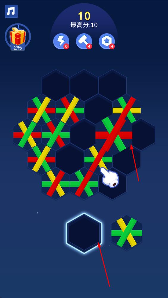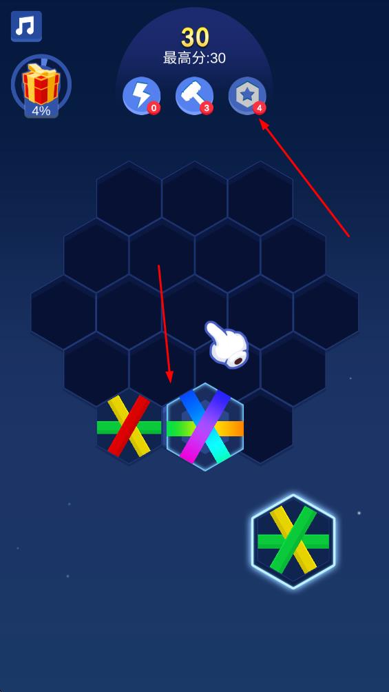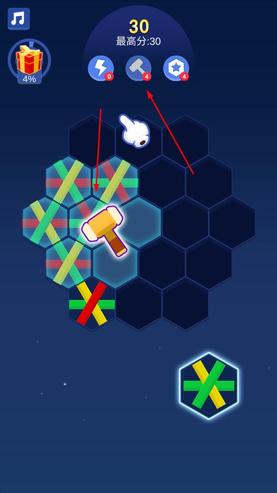2、点击锤子道具,选定网格中六边形,消除对应块,优化布局推进关卡。