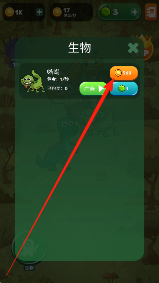 2、合成中途,寻找并合并两种相同的生物,拥有新生物后继续合并,观察生物逐步向人类进化的过程,推进进度。