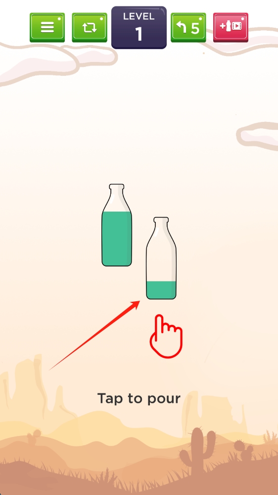 1、关卡1中,点击装有绿色液体的瓶子,将液体倒入另一个瓶子,完成分装,点击装饮料。