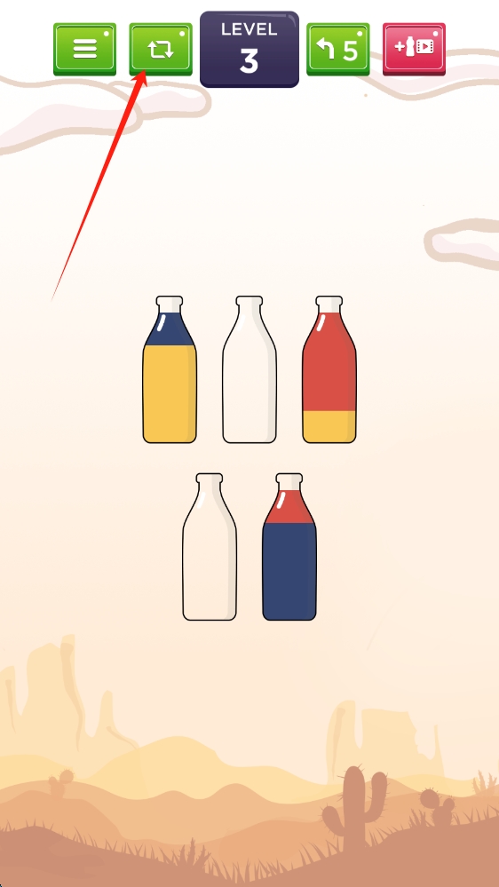 3、关卡3若操作失误,点击上方绿色重置按钮,重新开始液体分装,点击按钮重开当前关卡。