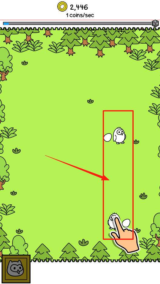 2、点完木箱,出现两只小鸟和蛋,按照提示,把同类型小鸟拖一起,它们会合并变异变成新物种,合并后上方金币会增加,每秒产出也变多,多合并小鸟攒更多金币。