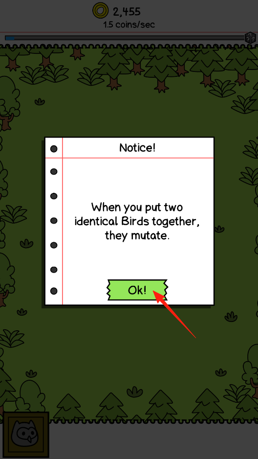 3、合并小鸟后,弹出提示框,说相同小鸟放一起会变异,点Ok确认,知道规则后,回到场景继续合并小鸟,每次合并都能让生物进化,还能提升金币收益。