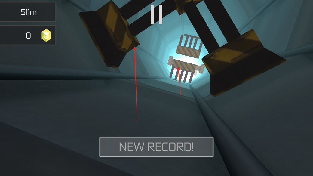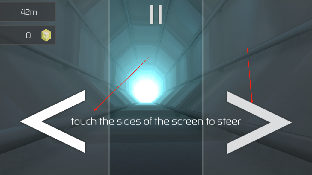 1、触摸屏幕左右两侧,控制坠落方向,躲避隧道内障碍物,朝着亮光处前进,每成功避开一次,就会增加一点坠落进度的记录。