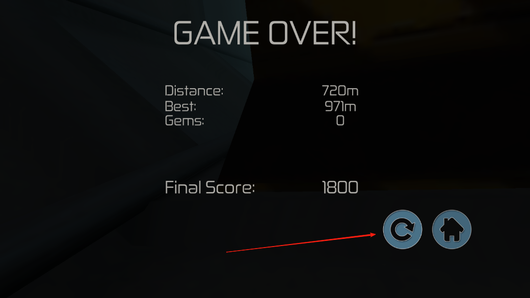 3、碰撞障碍物后会导致游戏结束,可点击重玩按钮再来一局,或点主页按钮返回,不断练习,提升躲避技巧,挑战更远距离。