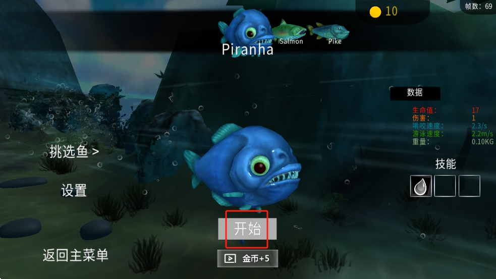 1、在选鱼界面,确认当前蓝色食人鱼数据,点击开始按钮即可进入游戏,还可通过挑选鱼更换其他鱼类。