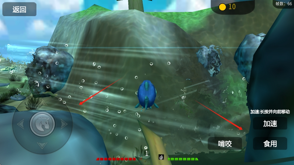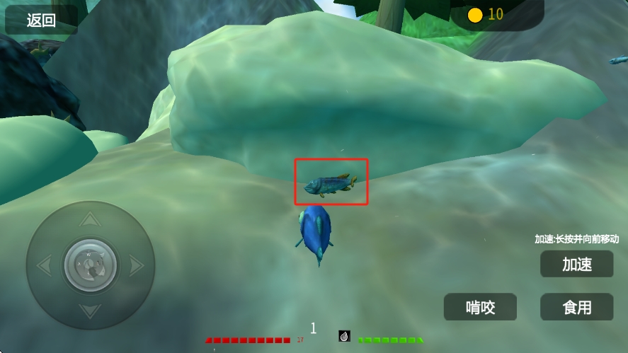 2、进入海底场景,用左侧摇杆控制鱼的移动方向,右边则是长按加速快速游动,还有啃咬和食用等技能按键。