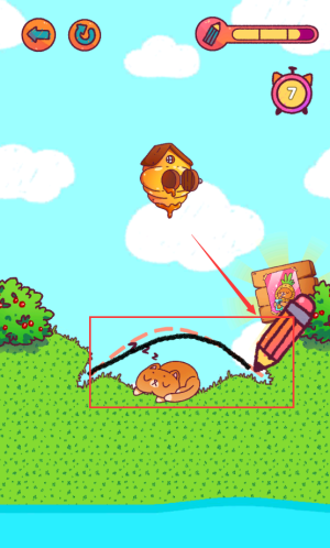 2、按照红框虚线箭头方向,拖动睡觉猫咪救蜜蜂。