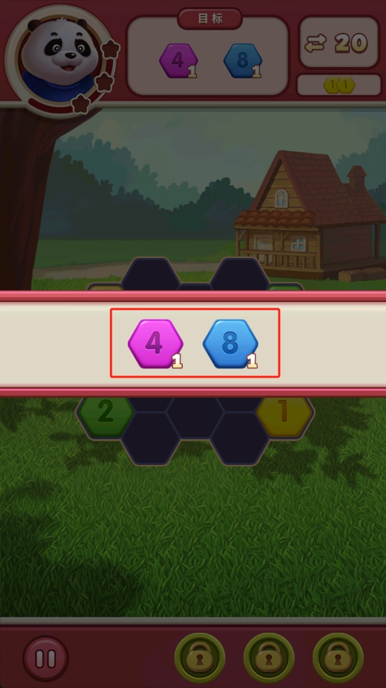 1、开局看顶部目标,需放置紫色4和蓝色8的六角块,观察下方空白区域,规划放置位置,让块落在合适六角格。