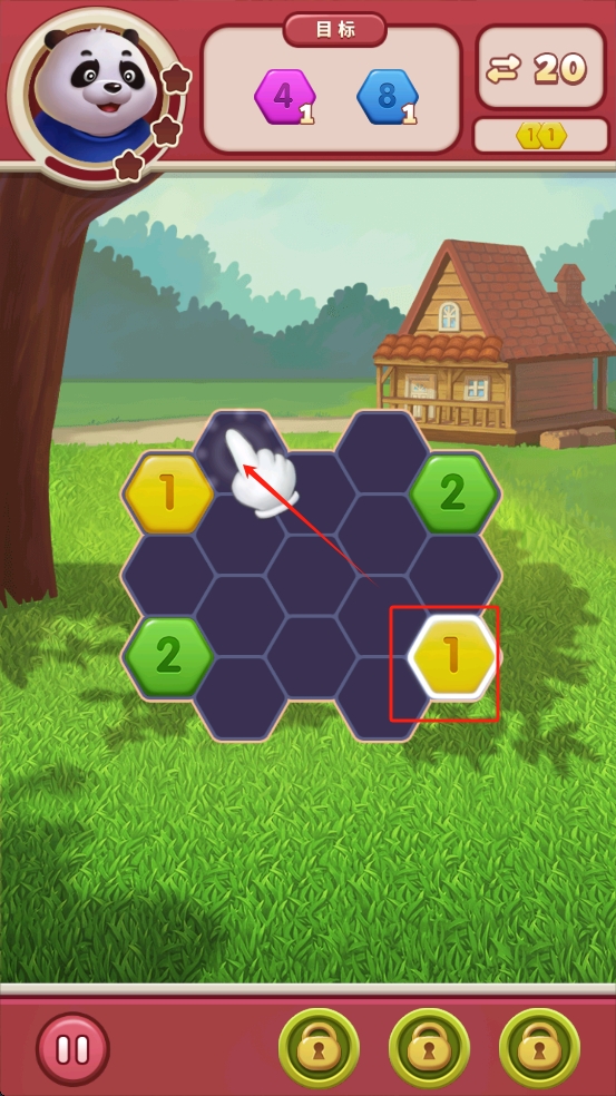2、根据指引,拖动黄色1的六角块到指定位置,放置时注意相邻块的连接,确保拼接符合规则,推进目标完成。