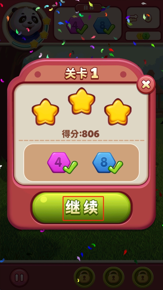 3、关卡1完成,得分806,目标块都放置成功,点击绿色继续按钮,进入下一关,挑战更复杂的六角块拼接。