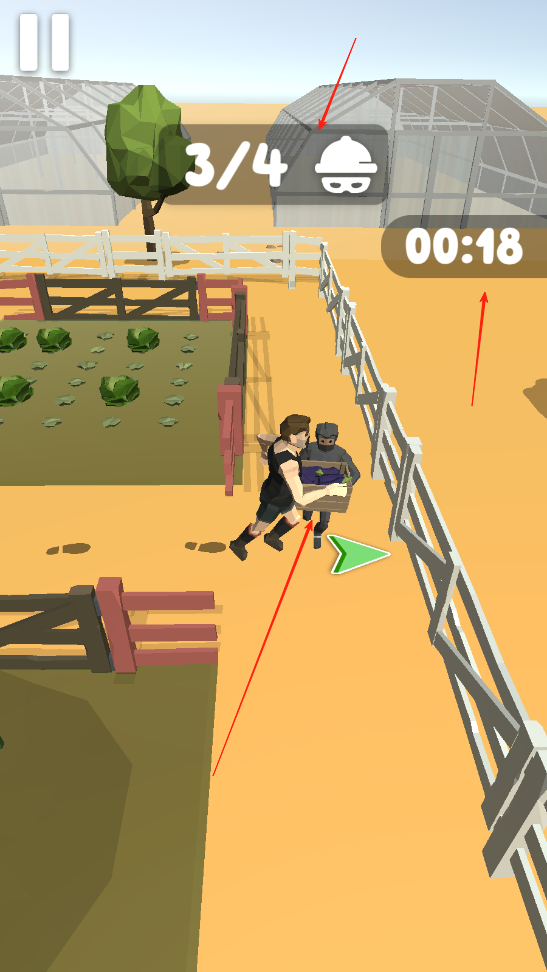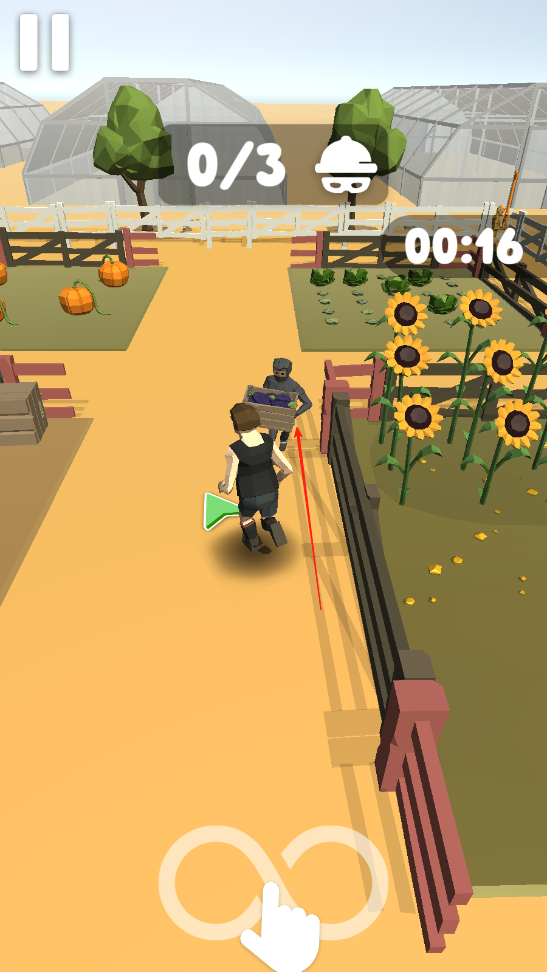 1、操控角色追逐在农场里偷菜的的盗贼,沿着箭头指引方向奔跑,在农场里拦截他们,每抓住一个完成一个任务目标。